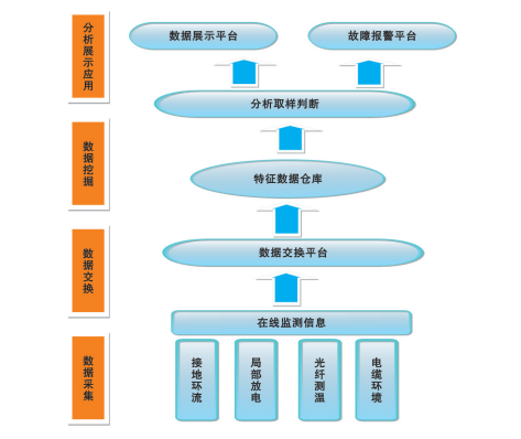 高壓電纜綜合在線監測平臺為采集信息提供相應的接口和界面,并針對其監測方式所需的數據處理、運算等提供處理平臺。將經過處理的信息顯示和發送給輸出設備,并通過人機交互界面,提供在線采集、監測、分析、報警,操控等功能。直觀的顯示電纜接頭、電纜橋架分布及電纜走向及現場各監測點位置,各測點的實時測量值(局放信號、溫濕度、接地">
